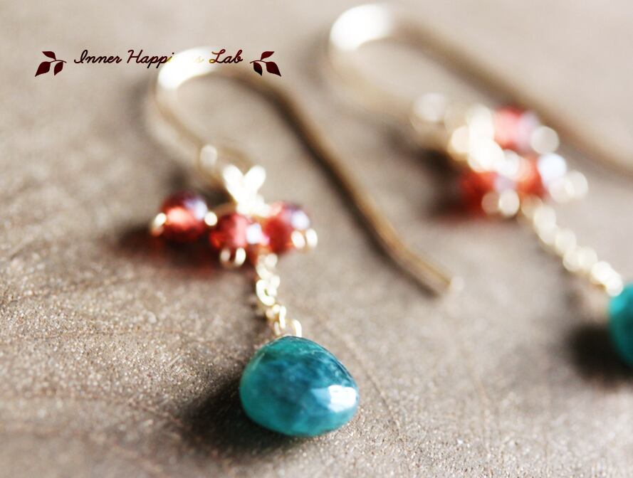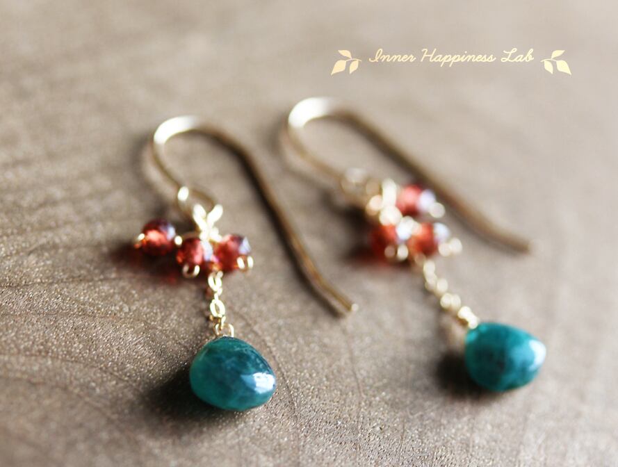 とても深いブルーグリーンをした希少なディープカラーグランディディエライトと赤色の鮮やかなモザンビークガーネットを組み合わせたピアスです。