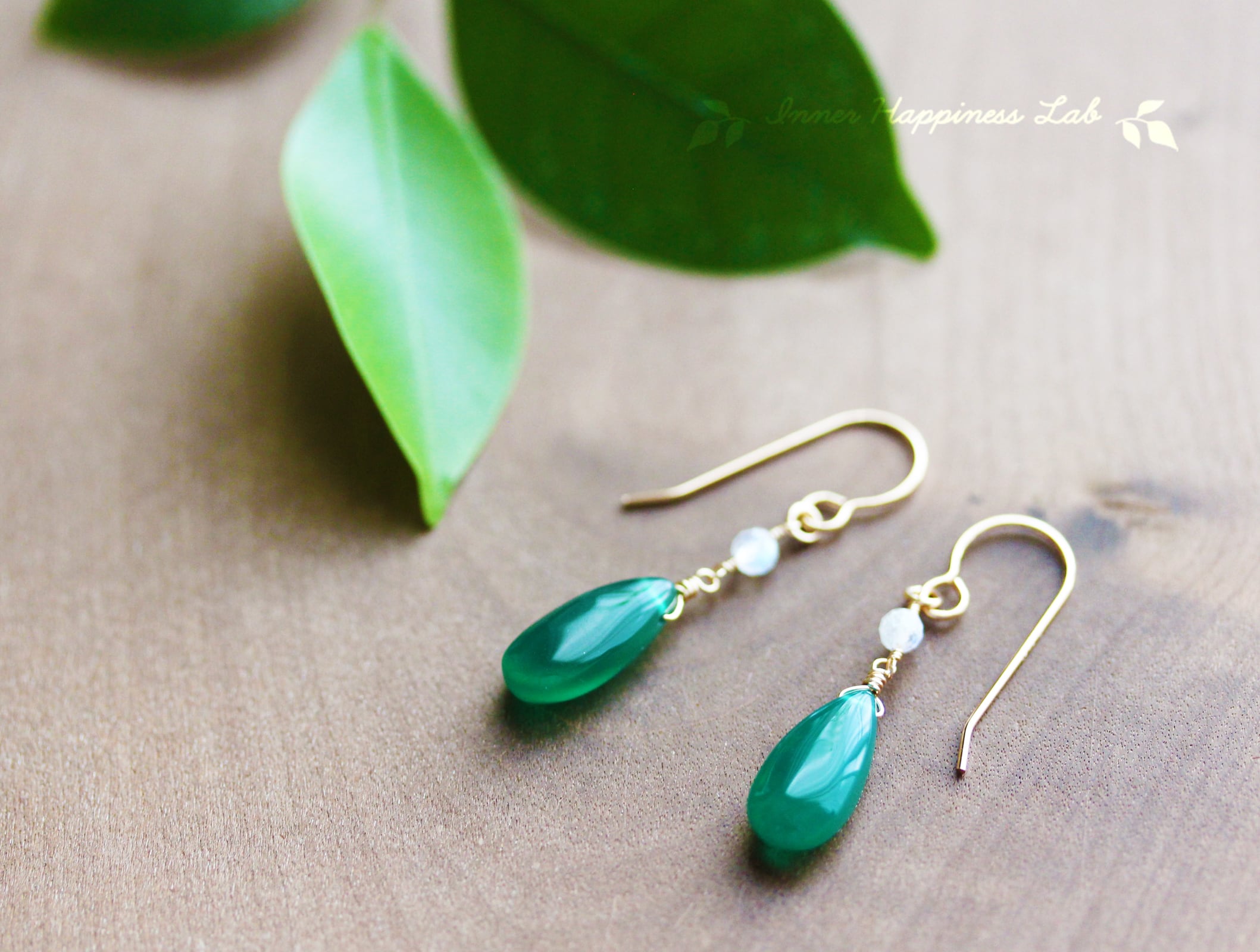 鮮やかなグリーン色のグリーンオニキスと神秘的なレインボームーンストーンを組み合わせたピアスです。