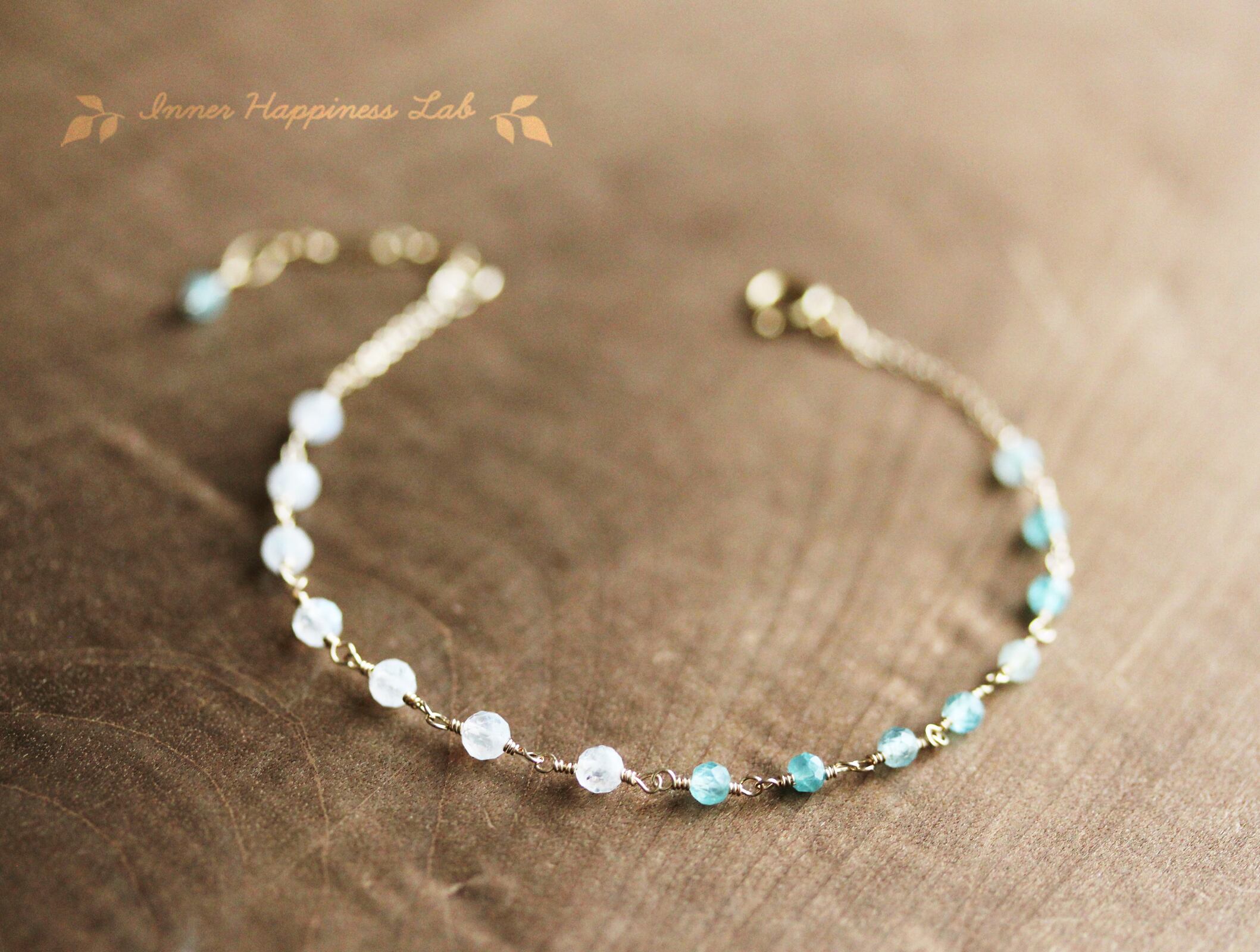 雪のようなレインボームーンストーンとブルーグリーンが特徴的なグランディディエライトを合わせたブレスレットです。まるで氷の国に迷い込んだかのような幻想的な雰囲気です。ぜひ冬のアイテムとしてお楽しみください。