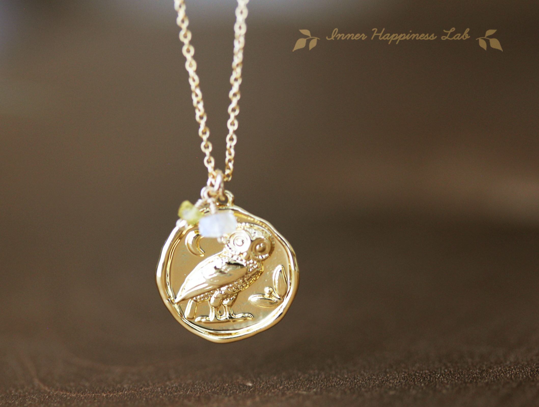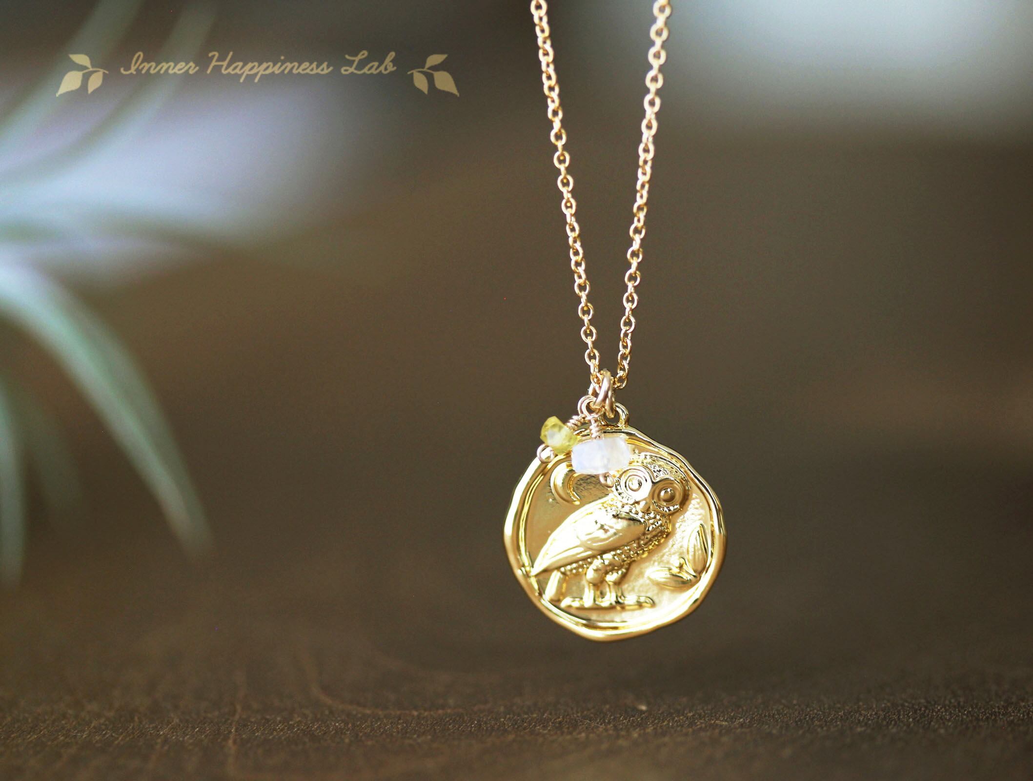 14KGF/ 女神アテナ フクロウのネックレス アンティークコイン風ネックレス ムーンストーン イエローサファイア 月 オリーブ