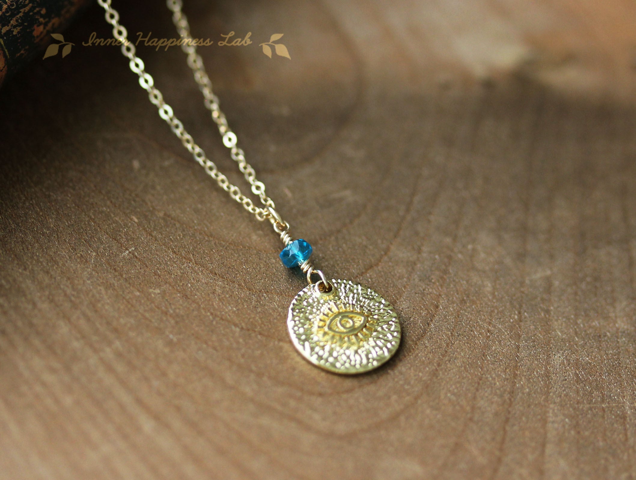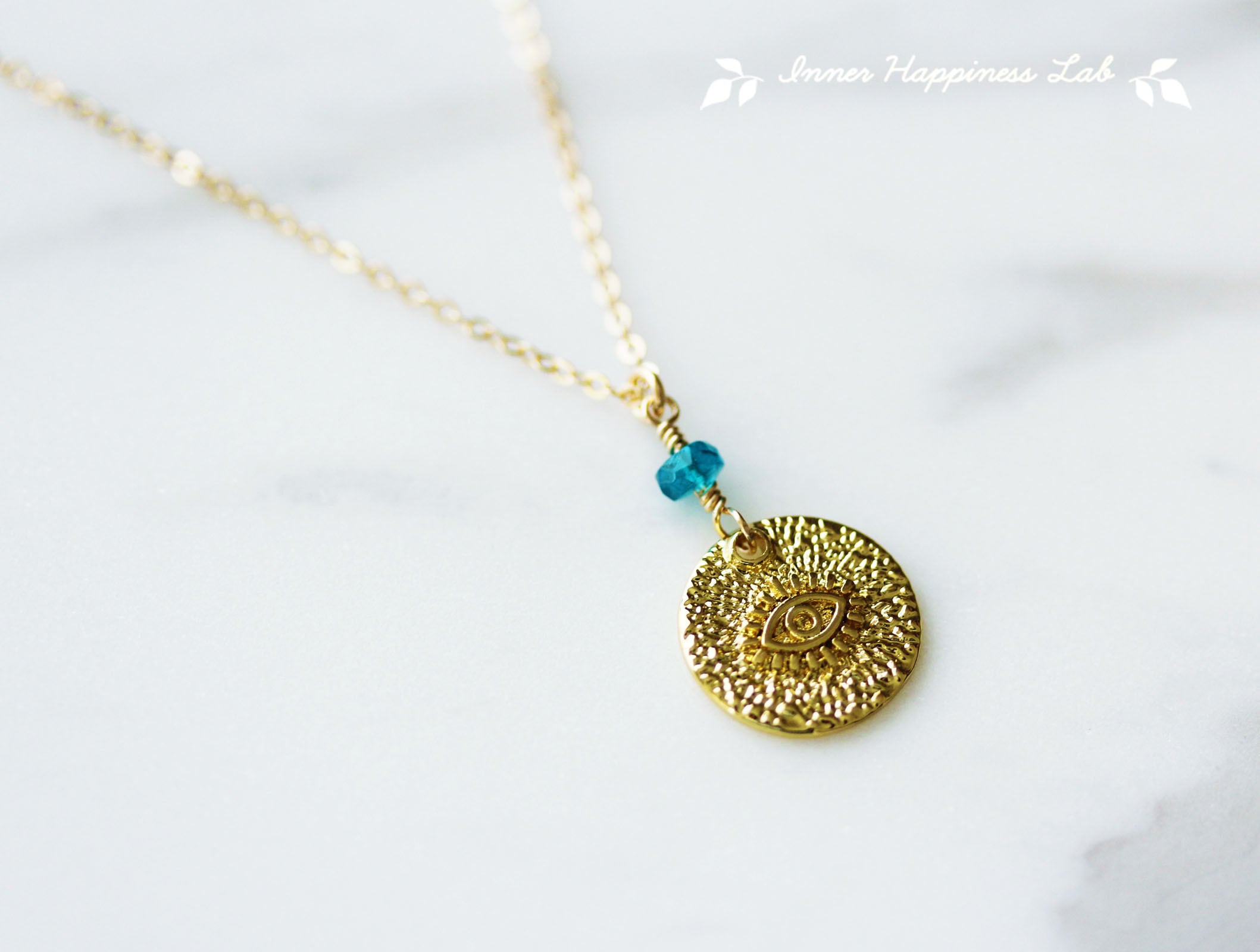 14KGF/ 魔除けのお守りネックレス イーブルアイ ネオンブルーアパタイトつき